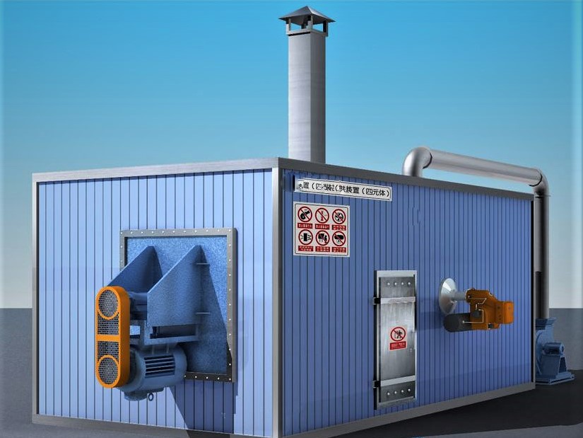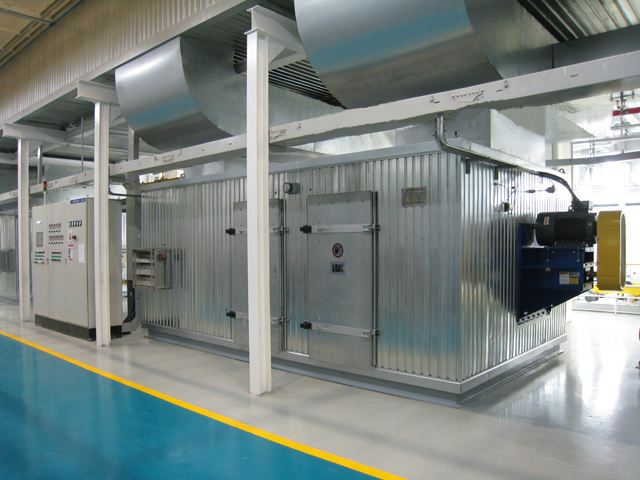 冷空气加热装置加热升温后由风机经高温过滤送入烘干设备内循环使用,烟气经多程换热装置换热后,温度低于 250℃排放,如需废气处理,将收集来的废气由废气通道直接送到加热装置的燃烧室高温燃烧后达标排放。